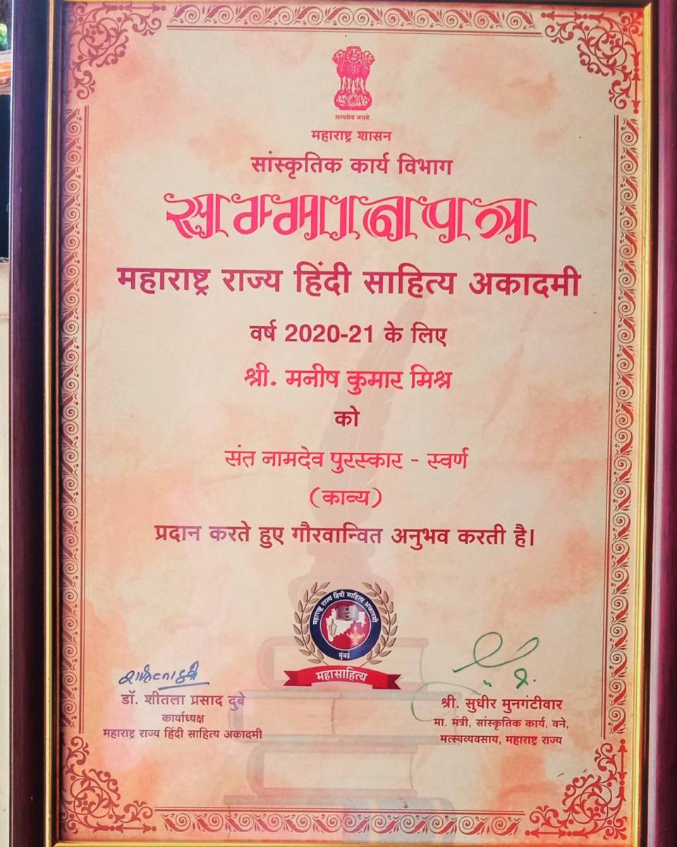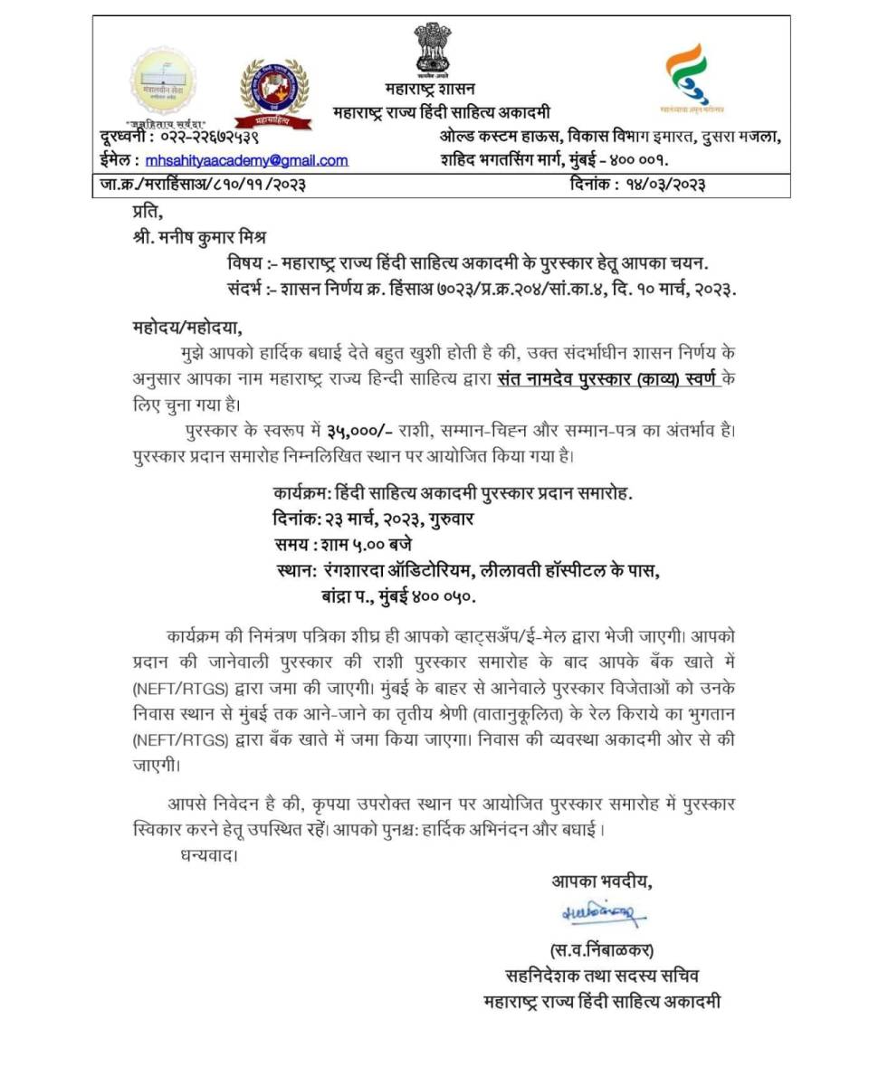 Selection for the Prestigious Sant Namdev Award for Outstanding Contribution to Poetry (Swarna) by Maharashtra State Hindi Sahitya Academy.